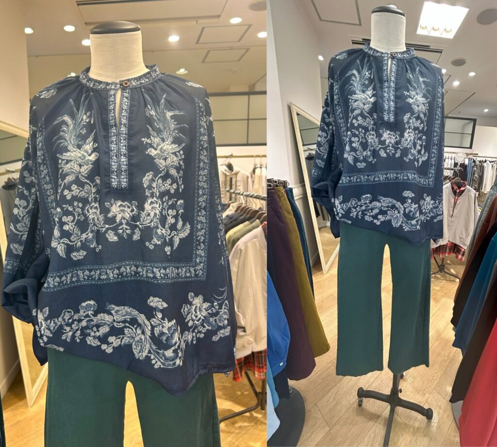 ネイビーに映える花柄プリント!秋コーデの主役ブラウス